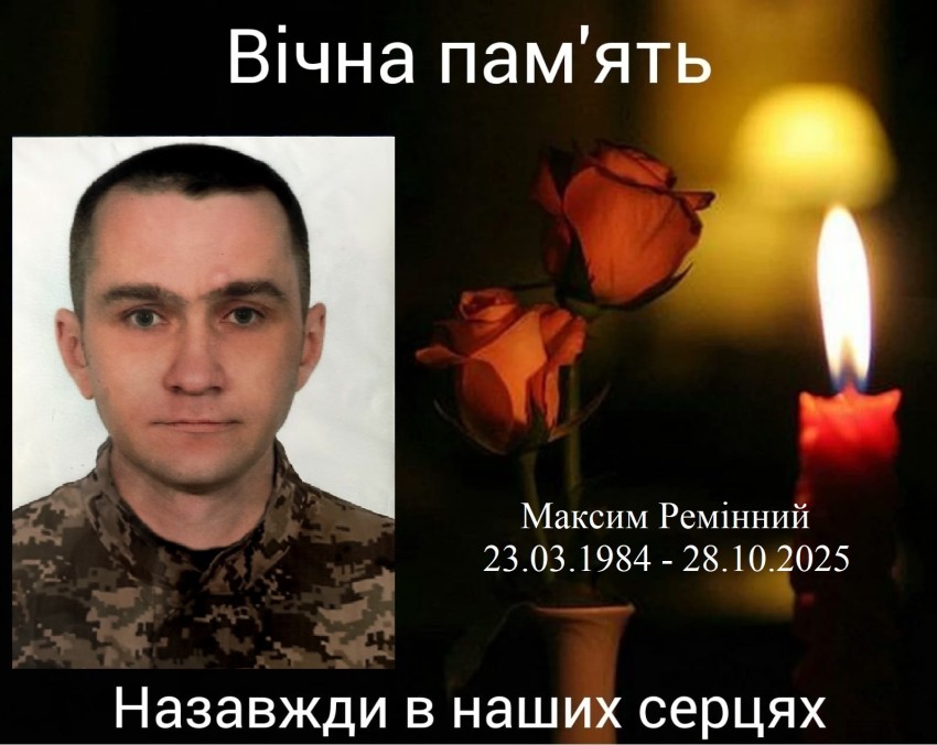 Молодщий сержант Максим Ремінний, 1984 року народження, помер у шпиталі 28 жовтня 2025 року від отриманих поранень під час виконання бойового завдання в районі населеного пункту Сінне Сумської області.
