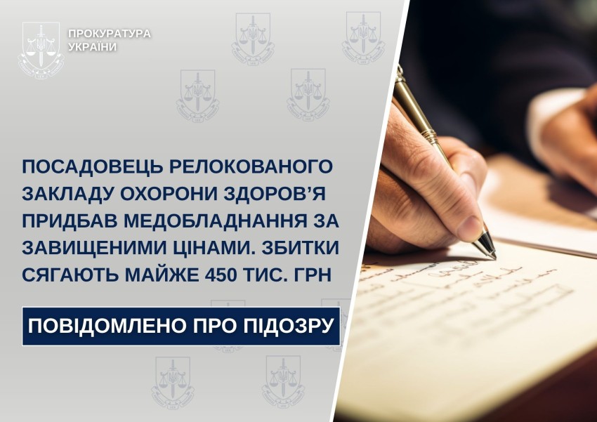 Посадовця релокованого закладу охорони здоров’я підозрюють у завдання збитків 450 тисяч гривень під час придбання медичного обладнання. Про це повідомили у прокуратурі області.