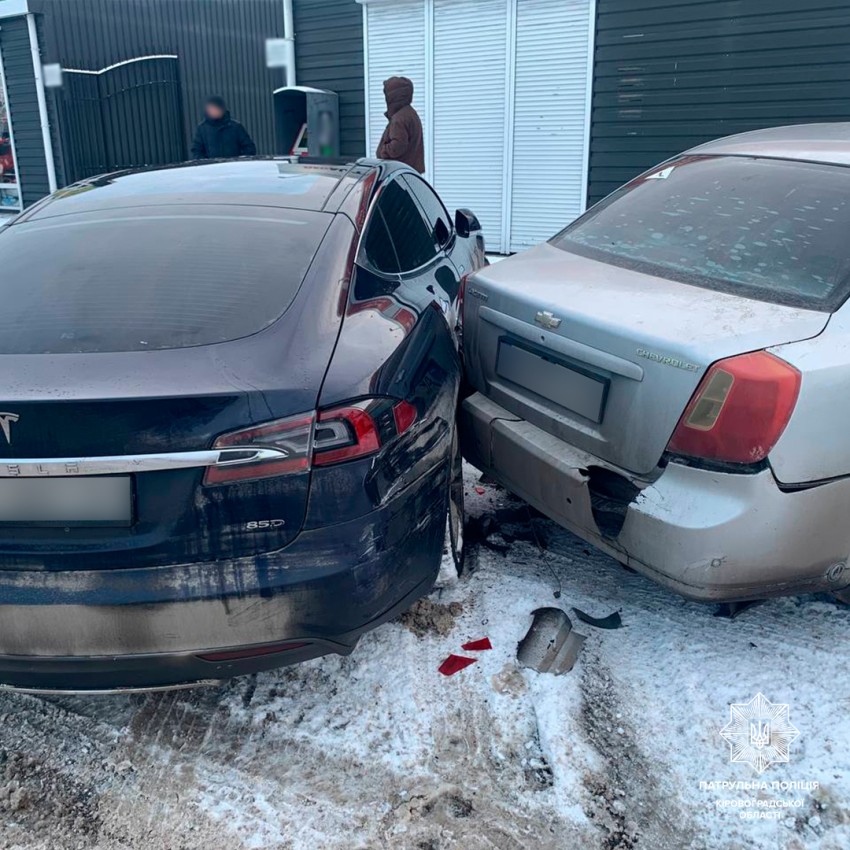 Водійка автомобіля Chevrolet Lacetti під час повороту праворуч не дотрималася безпечної швидкості руху, не врахувала дорожню обстановку, виїхала за межі проїзної частини та скоїла наїзд на припаркований легковик Tesla Model S і ролет магазину.