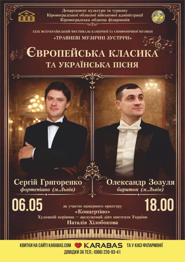 Захід відбудеться в рамках ХХIХ Всеукраїнського фестивалю камерної та симфонічної музики «Травневі музичні зустрічі». Тож цією програмою відбудеться відкриття фестивалю - за участю камерного оркестру «Концертіно» та запрошених артистів – Сергія Григоренка (фортепіано, м. Львів) та Олександра Зозулі (баритон, м. Львів).